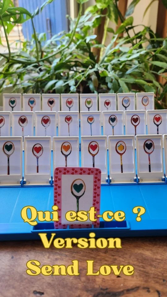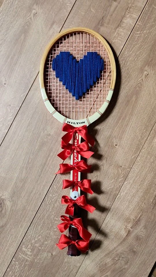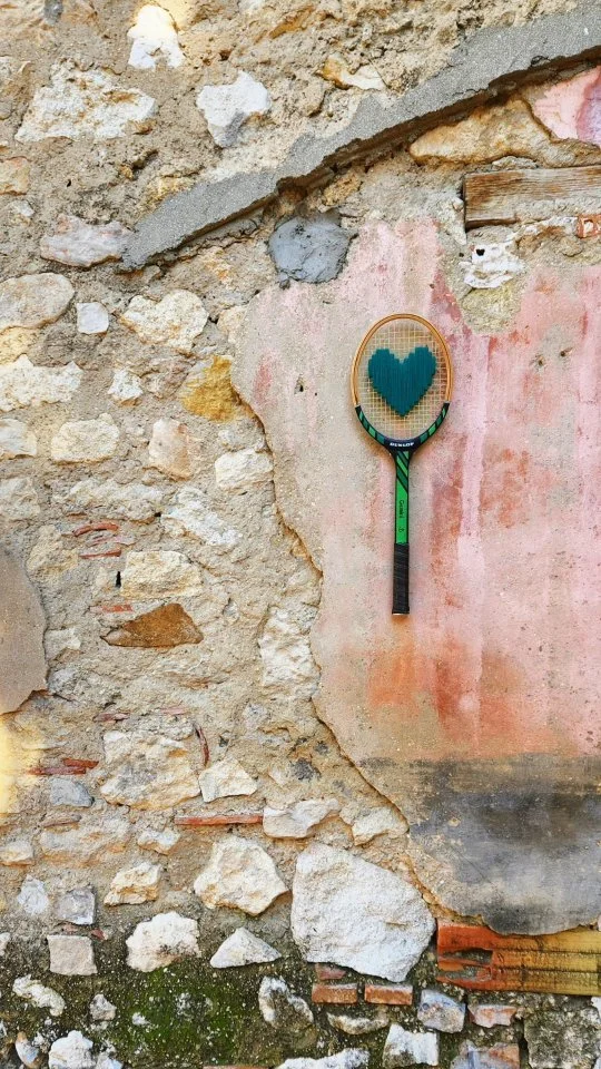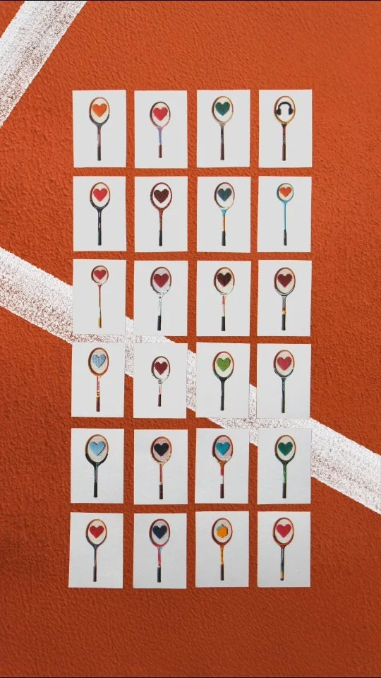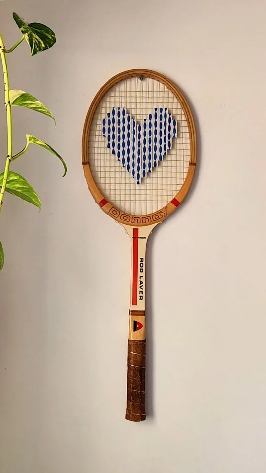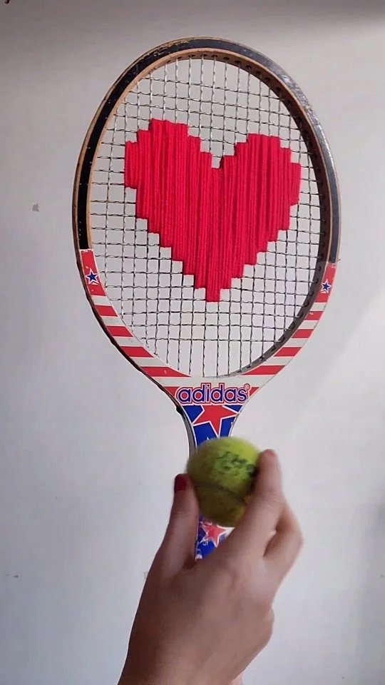D’anciennes raquettes de tennis, des années 60 aux années 80, chinées et brodées d’un coeur en laine pour envoyer plein de love dans le monde à coup d’aces et de revers.