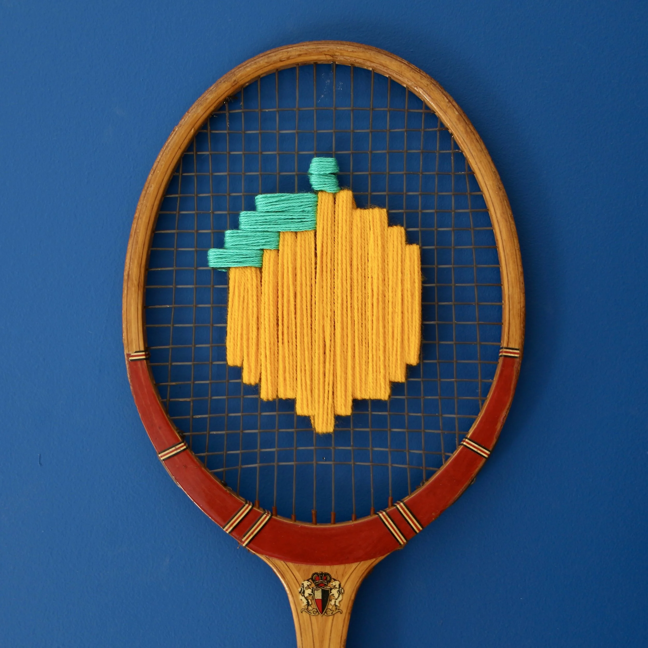 Dโanciennes raquettes de tennis chinรฉes et brodรฉes dโun coeur en laine pour envoyer plein de love dans le monde ร coup dโaces et de revers.